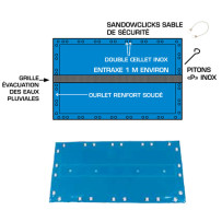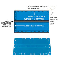 Options pour piscines enterrées : pitons gazon au lieu de pitons P béton, sandows 2 embouts au lieu de sandow continu, câble de soutien pour plage béton (protection contre le soulèvement).